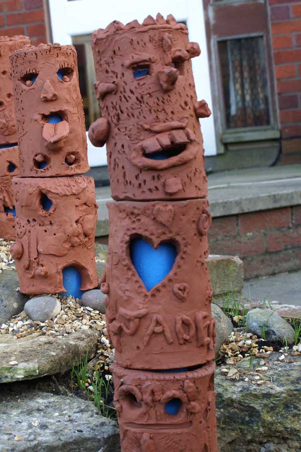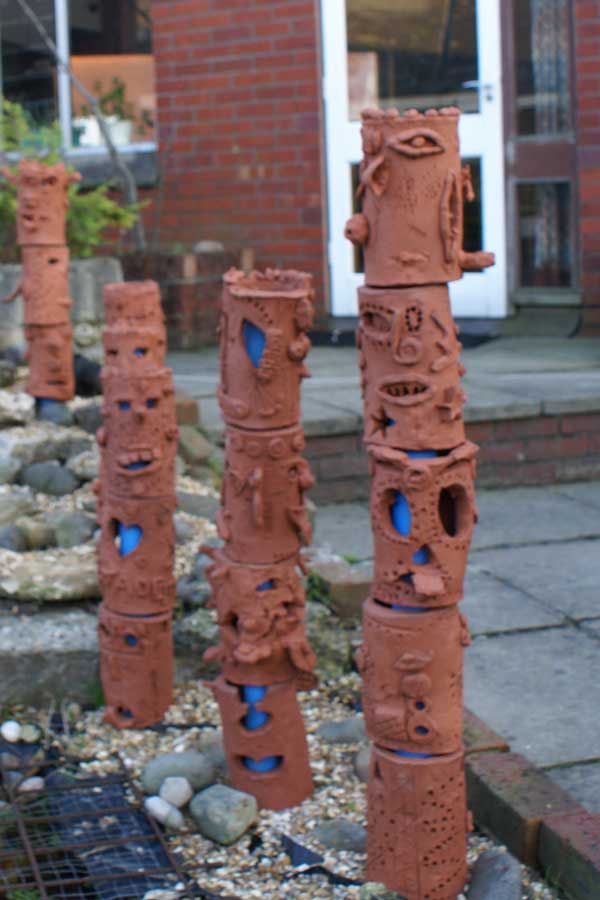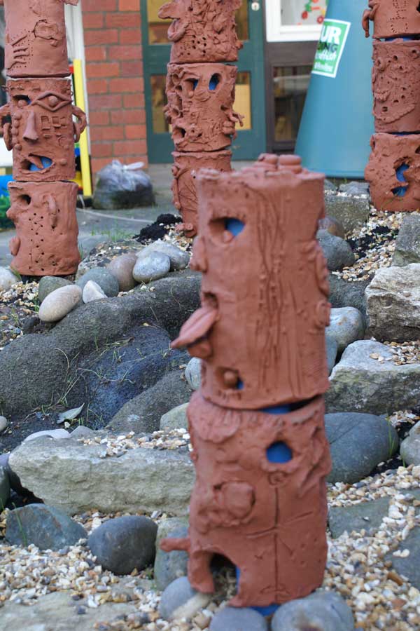 Children in Upper School worked in teams to create sections of totem polies for the courtyard garden.